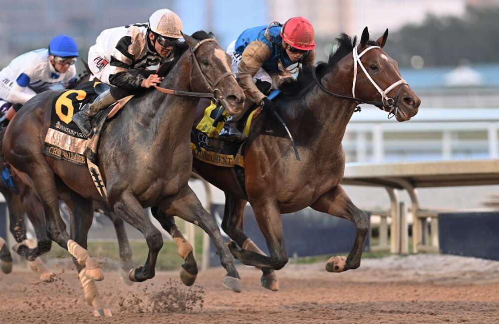Commandment and jockey Irad Ortiz, Jr (inside) hold off Chief Wallabee and Junior Alvarado by a neck to win the Coolmore Fountain of Youth Stakes (G2) for owner Wathnan Racing. The Brad Cox trainee has won three of four lifetime starts and gives sire Into Mischief another top Kentucky Derby prospect.