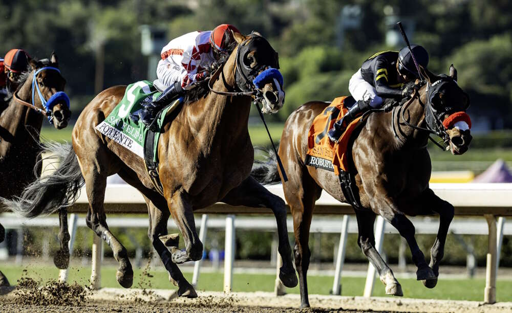 Speedway Stables’ Potente and jockey Juan Hernandez, left,, sneak up on Robusta (Emisael Jaramillo), inside, just in time to win the Grade II $200,000 San Felipe Stakes Saturday, March 7, 2026 at Santa Anita Park, Arcadia, CA, giving trainer Bob Baffert and jockey Juan Hernandez their second stakes wins on the day. Benoit Photo